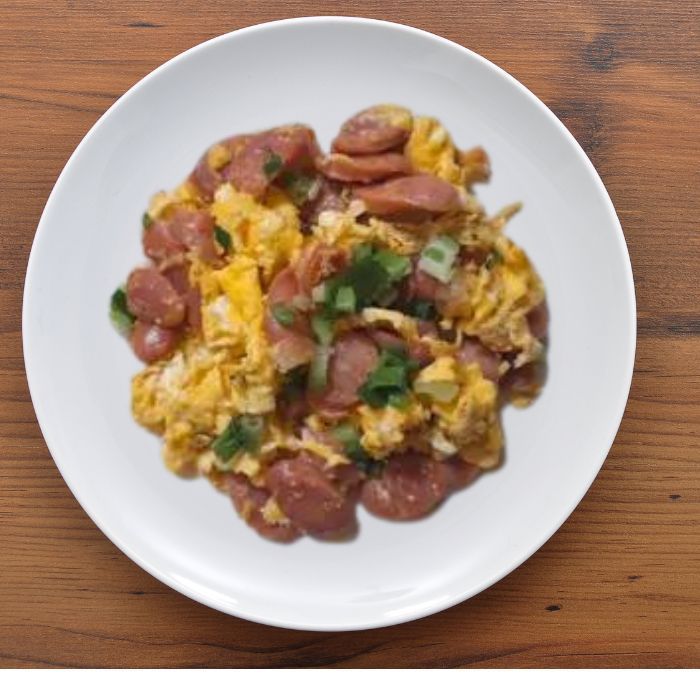 2.平底鍋小火熱鍋 ,加一湯匙的油倒入香腸翻炒30秒後,再倒入雞蛋液,翻炒成形後裝盤。撒上蔥花。上菜-------開動!!!!