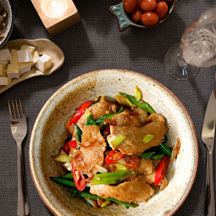 3.放回松阪豬肉片,並倒入所有調味醬料拌炒均勻入味。